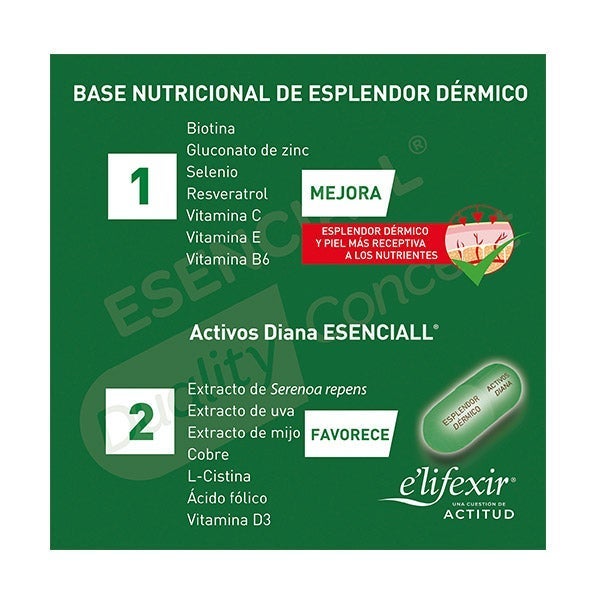 2. Ativos Diana ESENCIALL: Extrato de Serenoa repens, Extrato de uva, Extrato de milho, Cobre, L Cistina, Ácido fólico e Vitamina D3.