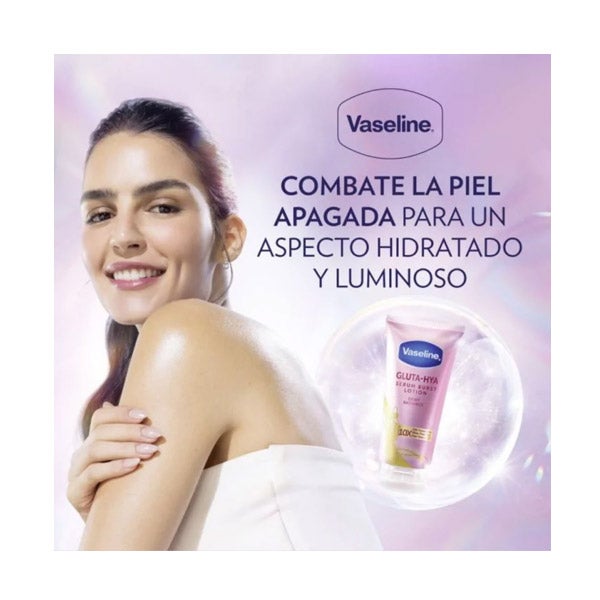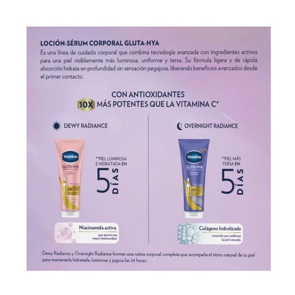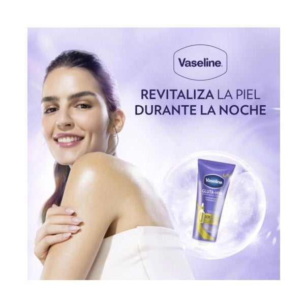 - Loção explosiva de sérum brilhante Gluta-Hya Overnight Radiance: Reviva sua pele enquanto dorme com o sérum corporal Vaseline Gluta-Hya Overnight Radiance. Sua fórmula especial utiliza a tecnologia GlutaGlow™, que contém antioxidantes que são dez vezes mais eficazes que a vitamina C, para combater a falta de brilho e proporcionar uma pele brilhante e radiante. Este sérum para o corpo também inclui ácido hialurônico, colágeno hidrolisado e vaselina, o que melhora a hidratação da pele e garante que a umidade seja mantida profundamente, ao mesmo tempo que contribui para firmar a pele cansada.