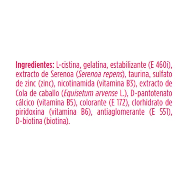 L-cistina, gelatina, estabilizante (E 460i), extracto de Serenoa (Serenoa repens), taurina, sulfato de Zinc (Zinc), nicotinamida (vitamina B3), Extracto de Cola de Caballo (Equisetum arvense L.), D-pantotenato cálcico (vitamina B5), colorante (E 172), clorhidrato de piridoxina (vitamina B6), antiaglomerante (E 551), D-biotina (biotina).
