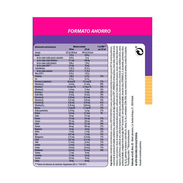 Almidón de maíz hidrolizado, sacarosa, ACEITES VEGETALES (canola, girasol de alto contenido en oleico, girasol, MCT de aceite de palmiste), concentrado de proteínas de la leche, maltodextrina, aislado de proteína de soja, oligofructosa (FOS*), MINERALES (citrato potásico, citrato sódico, fosfato de calcio tribásico, cloruro potásico, cloruro de magnesio, fosfato monobásico de potasio, carbonato cálcico, fosfato dibásico de potasio, cloruro sódico, fosfato dibásico de magnesio, sulfato ferroso, sulfato de zinc, sulfato de manganeso, sulfato cúprico, yoduro potásico, cloruro de cromo, selenito de sodio, molibdato sódico), aroma (proteína de leche), emulgente: lecitina de soja, DHA** de aceite de C.cohnii (proteína de leche), cloruro de colina, VITAMINAS (C, E, niacinamida, pantotenato cálcico, B1, B6, B2, palmitato de vitamina A, ácido fólico, K1, biotina, D3, B12), antioxidantes (E304, E306), taurina, mioinositol, tartrato de camitina, Lactobacillus acidophilus.