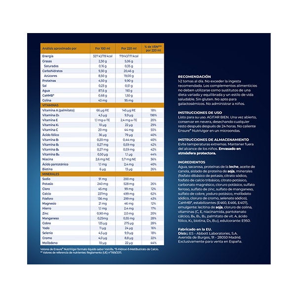 Agua, sacarosa, proteínas de la leche, aceite de canola, aislado de proteína de soja, minerales (fosfato dibásico de potasio, citrato sódico, fosfato de calcio tribásico, citrato potásico, carbonato magnésico, cloruro potásico, sulfato ferroso, sulfato de zinc, sulfato de manganeso, sulfato de cobre, yoduro potásico, molibdato sódico, cloruro de cromo, selenato sódico), CaHMB, estabilizantes (E460, E466, E407), emulgente: lecitina de soja, cloruro de colina, vitaminas (C,E, niacinamida, pantotenato cálcico, B6, B1, B2, palmitato de vit.A, ácido fólico, k1, biotina, D3, B12), edulcorante: E950.