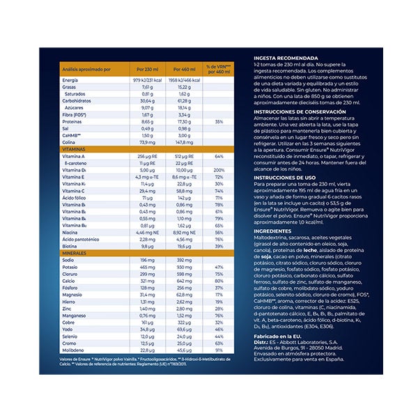 Maltodextrina, sacarosa, aceites vegetales (girasol de alto contenido en oleico, soja, canola), proteínas de leche, aislado de proteína de soja, cacao en polvo, minerales (citrato potásico, citrato sódico, cloruro de sódico, cloruro de magnesio, fosfato sódico, fosfato potásico, cloruro potásico, carbonato cálcico, sulfato ferroso, sulfato de zinc, sulfato de manganeso, sulfato de cobre, molibdato sódico, yoduro potásico, selenito sódico, cloruro de cromo), FOS*, CaHMB**, aroma, corrector de acidez, E525, cloruro de colina, vitaminas (C, niacinamida, de-pantotenato cálcico, E, B6, B1, B2, palmitato de vit. A, beta-caroteno, ácido fólico, d-biotina, K1, D3, B12), antioxidantes (E304, E306).