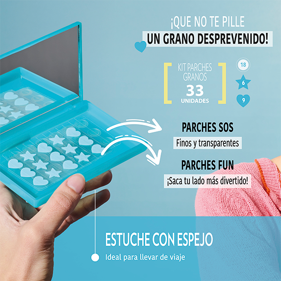 Este pack inclui 18 Adesivos SOS finos e transparentes para combater espinhas localizadas e 15 Adesivos FUN, em formato divertido e colorido, porque cuidar da sua pele não precisa ser chato. Com o Pack On The Go, você terá tudo o que precisa para manter sua pele livre de espinhas, protegida e pronta para qualquer momento, com estilo e atitude.