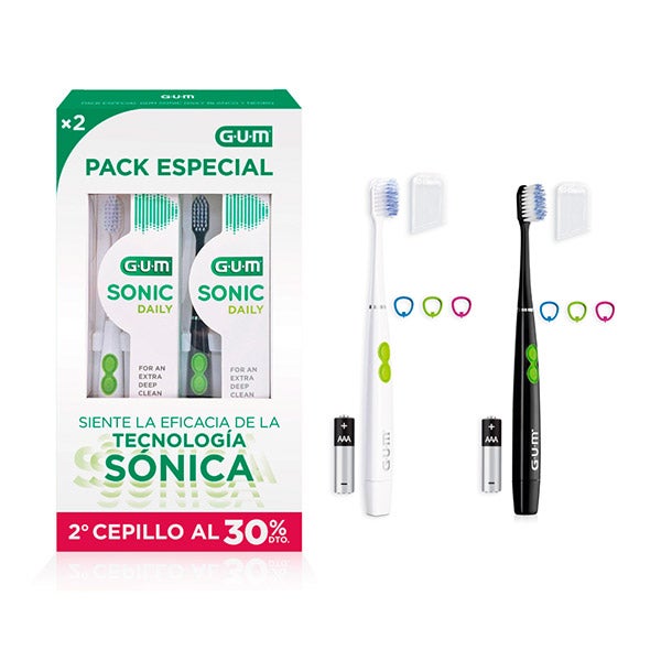 Este pack de escovas elétricas GUM® SONIC inclui uma escova sônica GUM SONIC DAILY branca e uma escova sônica GUM SONIC DAILY preta a um preço muito especial.