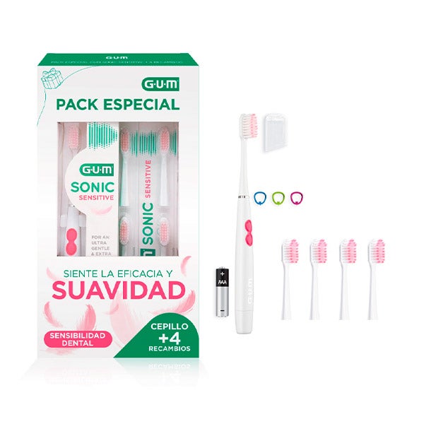 Este pack presente especial para sensibilidade dental inclui 1 escova ultrassuave GUM® SONIC SENSITIVE e 4 recargas para que você possa desfrutar da sua escova por mais tempo.