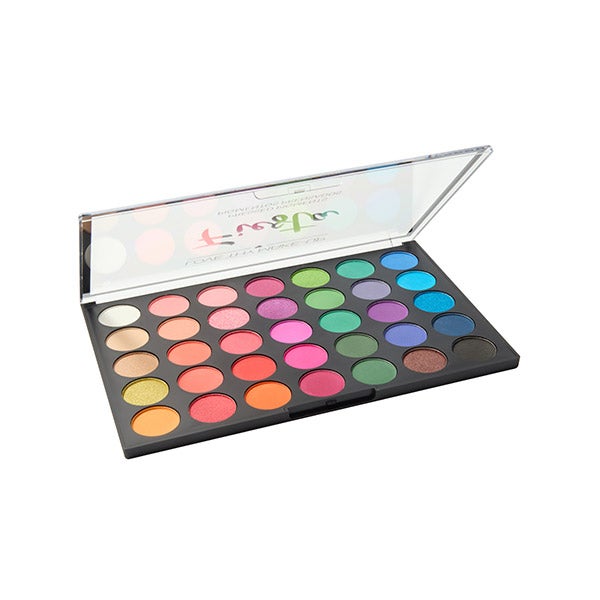 Paleta de 35 cores que contém uma mistura de pós mates e brilhantes, altamente pigmentados e fáceis de esfumar.