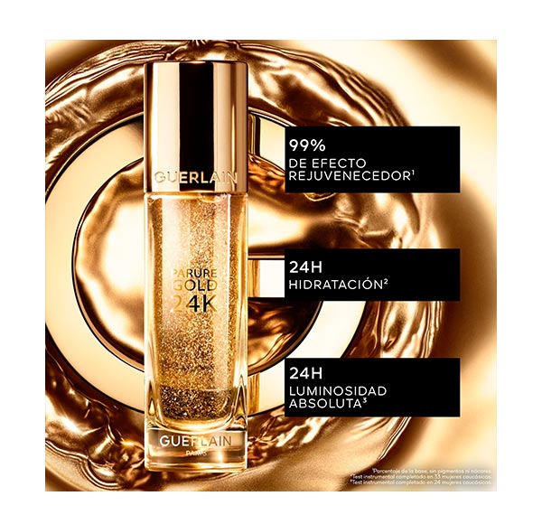 Fiel à equação mágica que caracteriza a série Parure Gold, a base de maquiagem Parure Gold 24K, com 99% de efeito rejuvenescedor¹, enriquecida com um toque de ouro de 24 quilates, proporciona 24 horas² de luminosidade absoluta e 24 horas³ de hidratação. Concentrado puro de brilho, Parure Gold 24K é a garantia de uma maquiagem impecável e sublime e de uma pele mais bonita dia após dia.