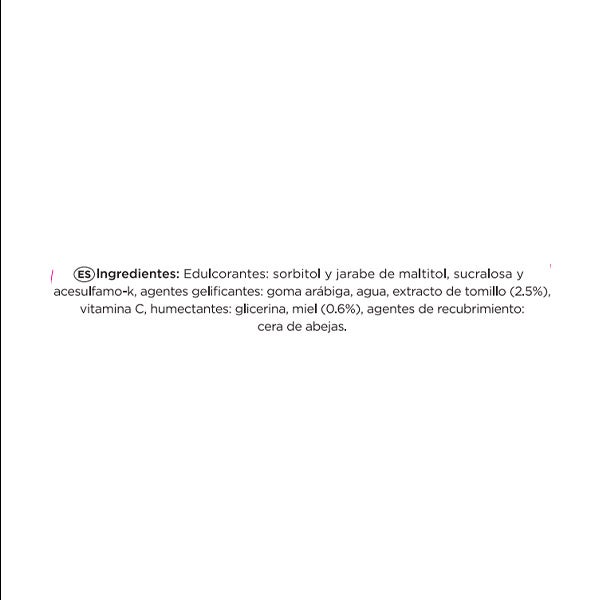 Edulcorantes: sorbitol y jarabe demaltitol, sucralosa y acesulfamo-k, agentes gelificantes: goma arábiga, agua, extracto de tomillo (2.5%), vitamina C, humectantes: glicerina, miel (0.6%), agentes de recubrimiento: cera de abejas.