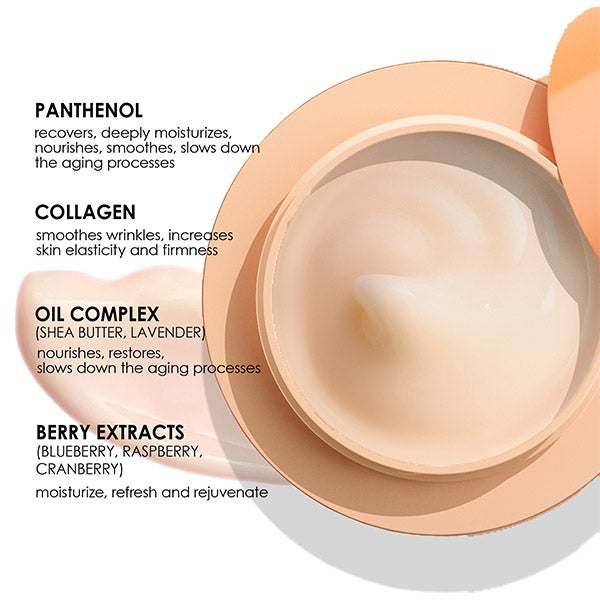 O complexo de óleos e o colágeno nutrem e suavizam a pele, dando-lhe flexibilidade e elasticidade.