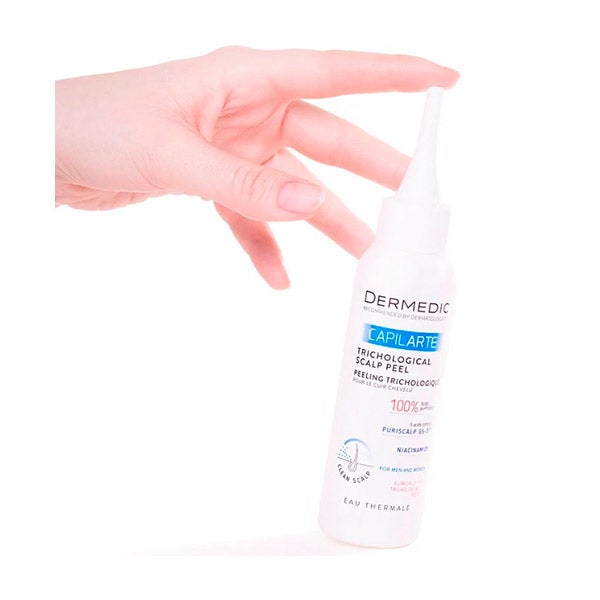 CAPILARTE Peeling tricologico couro cabeludo - Desenvolvido por tricologistas, a inovadora fórmula de peeling dermatológico foi clinicamente testada em estudos de eficácia e segurança. Sua ação baseia-se em uma composição sinérgica de cinco ácidos, entre eles o ácido glicólico e o ácido salicílico - Puriscalp GS-5TM. Esta garante uma limpeza profunda do couro cabeludo eliminando as células mortas, o sebo e os contaminantes ambientais e desbloqueia os estuários do folículo para melhorar a absorção dos princípios ativos. A niacinamida ajuda a reduzir a oleosidade do couro cabeludo, inibe a liberação de mediadores inflamatórios e tem efeitos antioxidantes. O suco de aloe vera e a seiva de bétula presentes na fórmula proporcionam uma hidratação adequada, reduzem a coceira e minimizam o risco de irritação. A esfoliação também favorece a manutenção de um microbioma saudável do couro cabeludo.