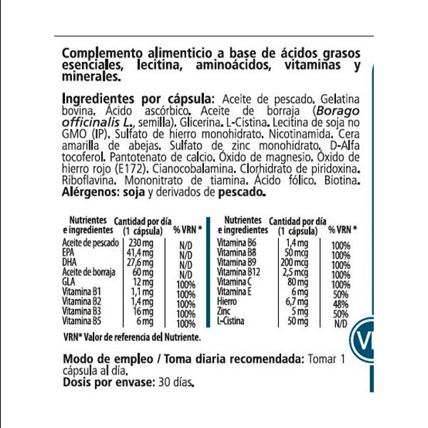 Ingredientes por cápsula blanda: aceite de pescado, gelatina bovina. Acido ascórbico. Aceite de borraja (borago officinalis L. semilla). Glicerina. L-cistina. Lecitina de soja no GMO (IP). Sulfato de hierro monohidrato. Nicotinamida. Cera amarilla de abejas. Sulfato de zinc monohidrato. D-alfa tocoferol. Pantotenato de calcio. Óxido de magnesio. Óxido de hierro rojo (E172). Cianocobalamina. Clorhidrato de piridoxina. Riboflavina. Mononitrato de tiamina. Ácido fólico. Biotina.