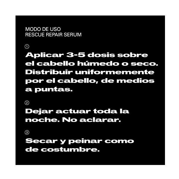 Aplicar 3-5 doses de sérum nas mãos e distribuir do meio às pontas. Escovar e deixar agir a noite toda. Não enxaguar. Pela manhã, pentear o cabelo.
