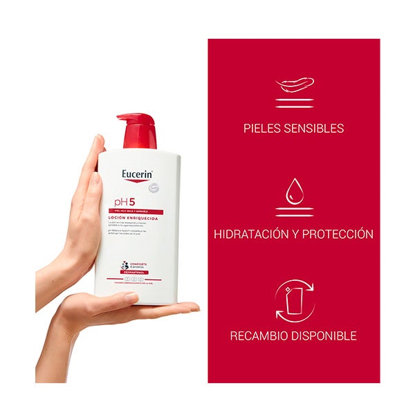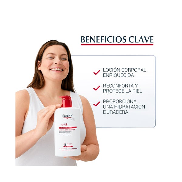 Eucerin pH5 Loção Enriquecida Corporal F é adequada para pele propensa a alergias do tipo 1, como a rinite alérgica, e para crianças a partir de três anos. Antes de aplicar um novo produto, faça um pequeno teste aplicando-o na parte interior do cotovelo.