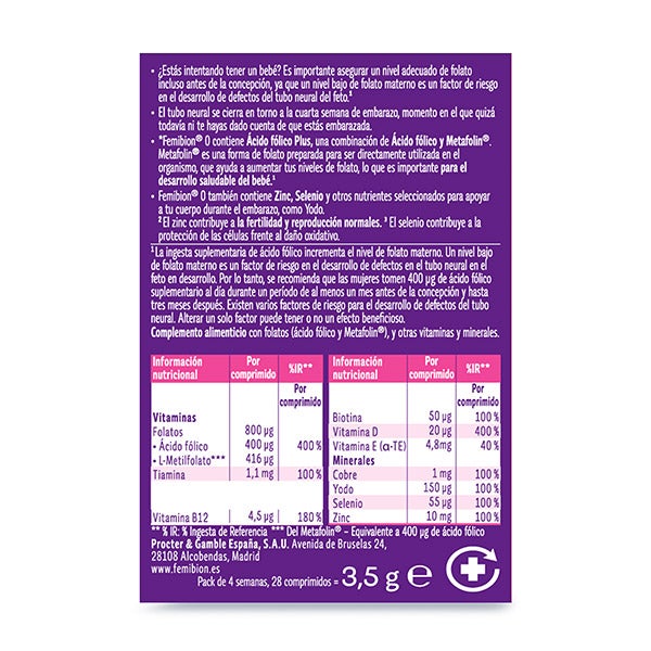 Os suplementos alimentares de Femibion® não devem ser utilizados como substitutos de uma dieta variada e equilibrada e de um estilo de vida saudável. Não exceder a dose diária recomendada (1 comprimido no Femibion 0).