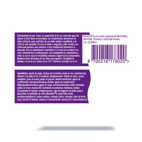 Agente De Carga: Celulosa Microcristalina; Óxido De Zinc; Maltodextrina; Vitamina E (Acetato De DL-A-Tocoferol), Antiaglomerante: Fosfato De Calcio; Azúcar, Emulgente: Goma De Acacia; Jarabe De Glucosa; Almidón Modificado, Agente De Recubrimiento: Hidroxipropilcelulosa; Almidón, Agente De Recubrimiento: Hidroxipropilmetilcelulosa, Agente De Carga: Carboximetilcelulosa Sódica Reticulada; Sulfato De Cobre; Vitamina B6 (Clorhidrato De Piridoxina); Riboflavina; Tiamina (Mononitrato De Tiamina), Antiaglomerantes: Sales De Magnesio De Ácidos Grasos; Ácido Fólico (L-Metilfolato De Calcio (Metafolin)); Ácido Fólico (Ácido Pteroilmonoglutámico); Yoduro Potásico; Seleniato Sódico, Colorante: Óxido De Hierro (Rojo); Biotina (D-Biotina); Vitamina D (Colecalciferol); Vitamina B12 (Cianocobalamina)