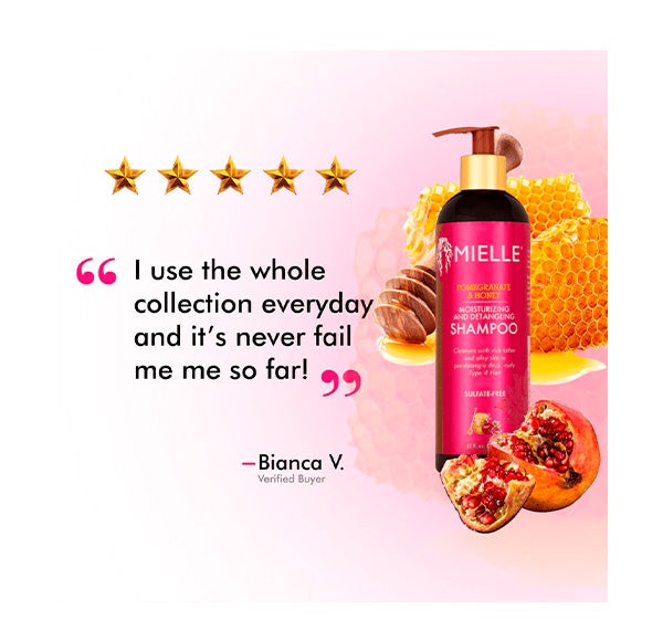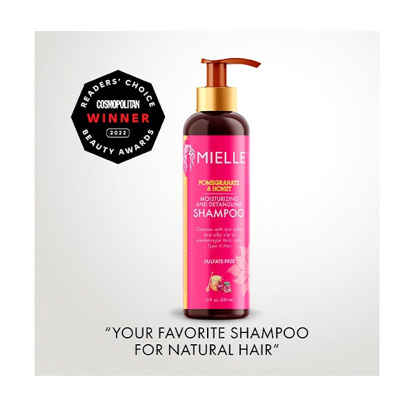O shampoo hidratante e desembaraçante de romã e mel da Mielle utiliza ingredientes frescos como o mel e o óleo de babaçu para eliminar a sujeira e a gordura do cabelo, ao mesmo tempo que conserva a hidratação necessária.