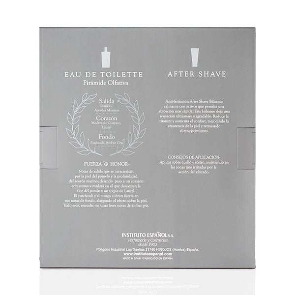 Fuerza y honor. Notas de salida que se caracterizan por la piel del pomelo y la profundidad del acorde marino, dejando paso a un corazón con aroma a madera en el que descansan la flor del jazmín y un toque de laurel. El patchouli y el musgo cobran fuerza en sus notas de fondo alargando el efecto sobre la piel. Todo esto envuelto en unas leves notas de ámbar gris.