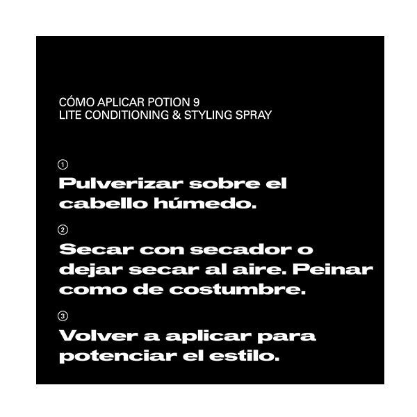 Pulverizar sobre cabelo úmido. Secar ao ar para ondas suaves ou usar secador. Utilizar calor para cachos definidos. Borrifar no seco para potencializar o estilo.