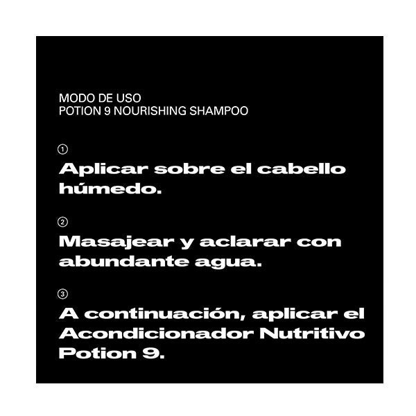 Aplicar o shampoo sobre o cabelo úmido, massagear desde a raiz até as pontas, e enxaguar com bastante água. Depois, aplicar o Condicionador Potion 9.