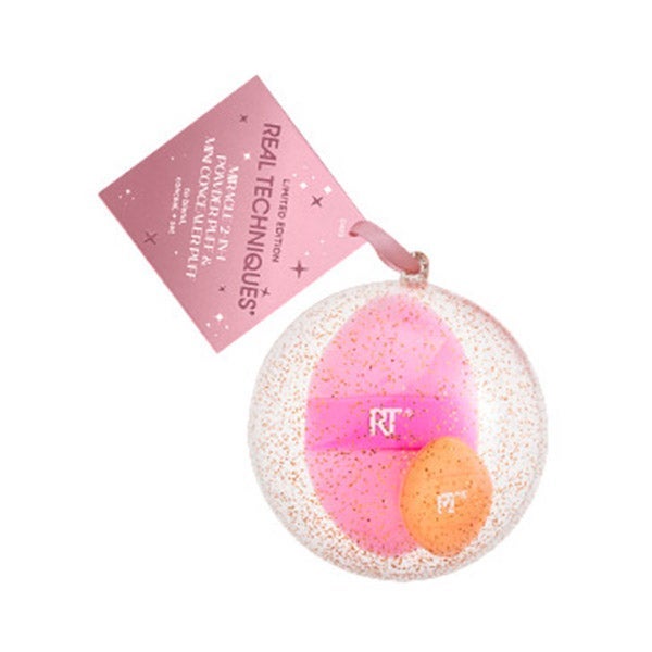 Dentro de uma bola de Natal ideal para presentear ou pendurar na sua árvore, contém a inovadora Miracle 2 in 1 powder puff para selar seu rosto e Mini Miracle Concealer Puff para aplicar seu corretivo.