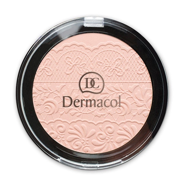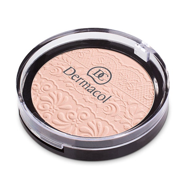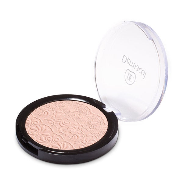 Um elegante pó compacto matificante com um atraente aroma a rosas em uma embalagem prática.