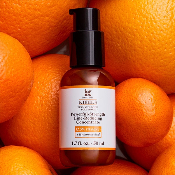 Powerful-Strength Line-Reducing Concentrate Serum, o sérum facial anti-idade com 12,5% de Vitamina C da Kiehl's, reduz as rugas, ajuda a prevenir danos de fatores externos e envelhecimento (proporciona uma ação antioxidante de longa duração) e estimula a produção de colágeno e elastina (mais ativa à noite).