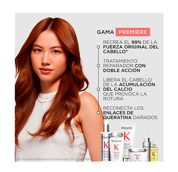 A linha Première, com sua dupla ação reparadora, quebra o ciclo de dano persistente no cabelo descalcificado com até +97% de reforço na estrutura interna, recria em 99% a força original do cabelo e oferece uma profunda penetração de ativos no interior da fibra capilar para conseguir reduzir o dano na superfície e no interior do cabelo.