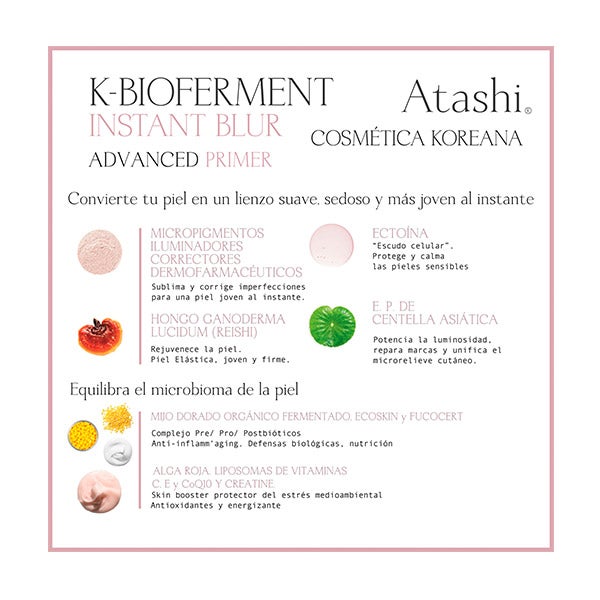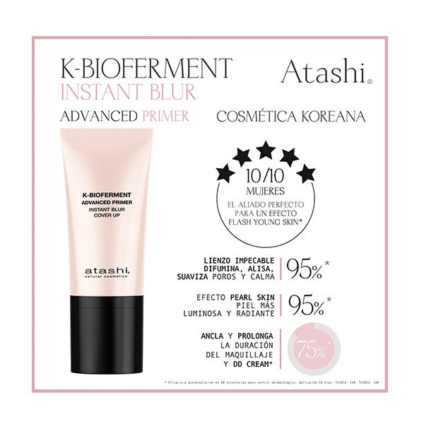 Atashi K-Bioferment Instant Blur Advanced Primer 50ml é um creme base invisível multitratamento que cobre imperfeições, unifica o tom, minimiza poros, manchas, marcas de acne, brilhos indesejados e rugas profundas.