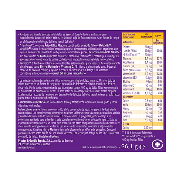 Não exceder a dose diária recomendada (1 comprimido no Femibion 1). Manter fora do alcance das crianças pequenas.