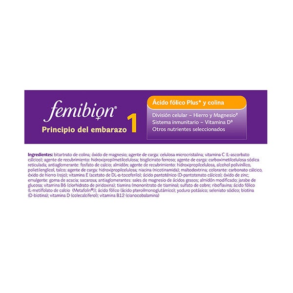 Os comprimidos de Femibion 1 contêm colina, ferro, vitaminas B1, B2, B6, B12, C, D, E, biotina, niacina, ácido pantotênico, iodo, ferro e selênio.