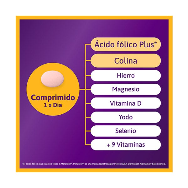 Bitartrato De Colina; Óxido De Magnesio, Agente De Carga: Celulosa Microcristalina; Vitamina C (L-Ascorbato Cálcico), Agente De Recubrimiento: Hidroxipropilmetilcelulosa; Bisglicinato Ferroso, Agente De Carga: Carboximetilcelulosa Sódica Reticulada, Antiaglomerante: Fosfato De Calcio; Almidón, Agente De Recubrimiento: Hidroxipropilcelulosa; Alcohol Polivinílico; Polietilenglicol; Talco, Agente De Carga: Hidroxipropilcelulosa; Niacina (Nicotinamida); Maltodextrina, Colorante: Carbonato Cálcico; Óxido De Hierro (Rojo); Vitamina E (Acetato De DL-α-Tocoferilo); Ácido Pantoténico (D-Pantotenato Cálcico); Óxido De Zinc, Emulgente: Goma De Acacia; Sacarosa, Antiaglomerantes: Sales De Magnesio De Ácidos Grasos; Almidón Modificado; Jarabe De Glucosa; Vitamina B6 (Clorhidrato De Piridoxina); Tiamina (Mononitrato De Tiamina); Sulfato De Cobre; Riboflavina; Ácido Fólico (L-Metilfolato De Calcio (Metafolin)); Ácido Fólico (Ácido Pteroilmonoglutámico); Yoduro Potásico; Seleniato Sódico; Biotina (D-Biotina); Vitamina D (Colecalciferol); Vitamina B12 (Cianocobalamina)
