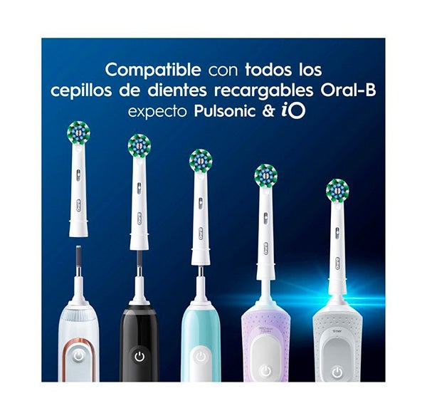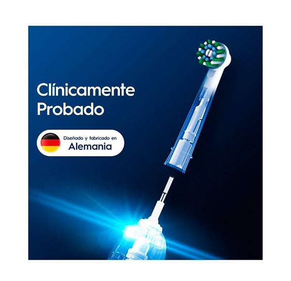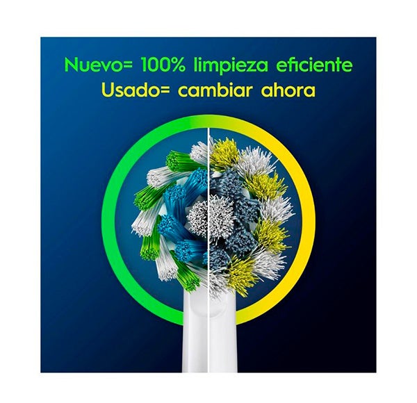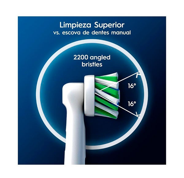 O cabeçal da escova de dentes Oral-B Pro CrossAction conta com mais de 2200 filamentos perfeitamente inclinados para eliminar até 100% mais placa bacteriana e conseguir dentes mais limpos e saudáveis em comparação com uma escova de dentes manual. Os cabeçais originais da Oral-B são projetados com novos filamentos em forma de X que limpam as áreas que os redondos não alcançam. O indicador de uso do cabeçal faz com que os filamentos passem de verde para amarelo para lembrar-te quando deves trocá-lo e manter 100% de eficácia na limpeza.