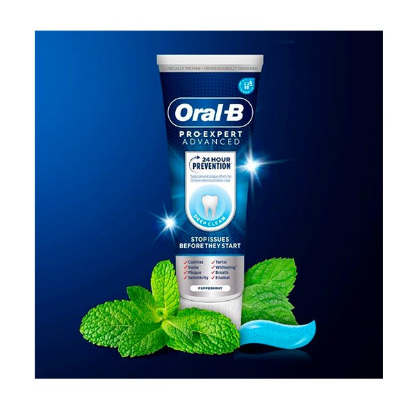 Oral-B Pro-Expert Advanced Science Limpeza Profunda, projetada profissionalmente com dentistas e testada clinicamente, previne os efeitos da placa bacteriana durante 24 horas ao ser usada 2 vezes ao dia, assim como sua adesão aos dentes e gengivas.
