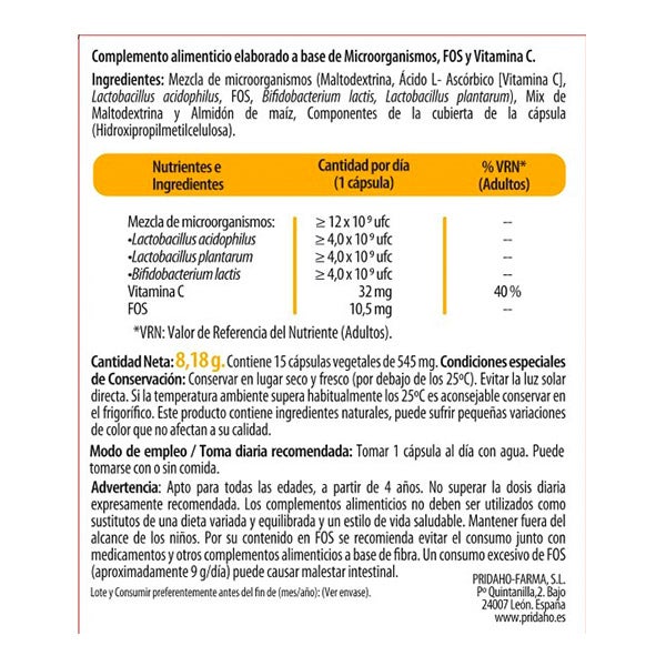 Mezcla de microrganismos (Maltodextrina, Acido l-ascórbico (Vitamina C) Lactobacillus acidophilus, FOS, Bifidobacterium lasctis, Lactobacillus plantarum), Mix de Maltodextrina y Almidón de maíz, Componentes de la cubierta de la cápsula. (Hidroxipropilmetilcelulosa).