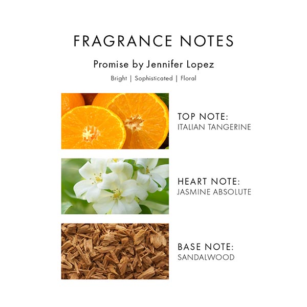 Promise de Jennifer Lopez é uma fragrância cativante inspirada na trajetória de Jennifer como atriz, artista e empresária. Começa com vibrantes notas de tangerina, bagas rosas e pera nashi, e revela um coração de jasmim, madressilva e lírio de Florença antes de se estabelecer em acordes quentes de sândalo e âmbar.