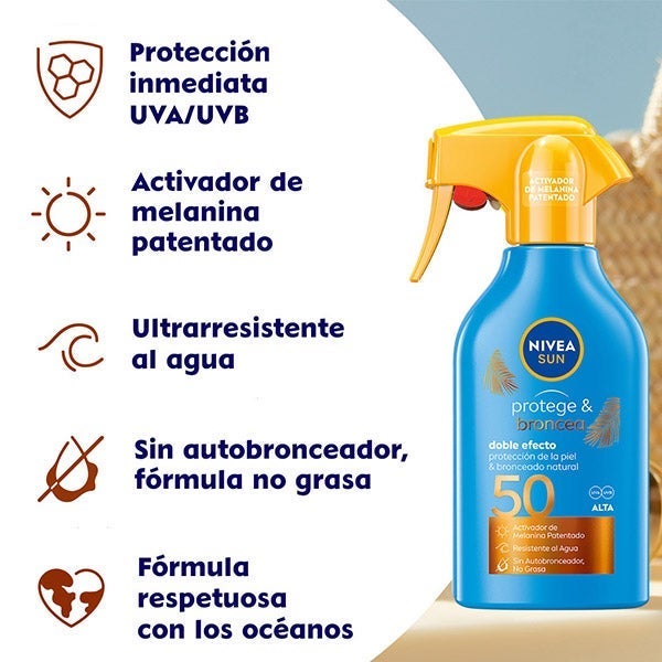NIVEA SUN Protege & Bronzeia Spray Solar FP 50 proporciona proteção UV imediata e um bronzeado natural da pele graças ao extrato pró-melanina que estimula a própria melanina da pele. Para um bronzeado bonito e saudável. Fórmula não gordurosa, resistente à água e sem autobronzeador. Fórmula Respeitosa com os Oceanos: sem os filtros UV Octinoxato, Oxibenzona nem Octocrileno. Sem Microplásticos. Fórmula 63% Biodegradável.