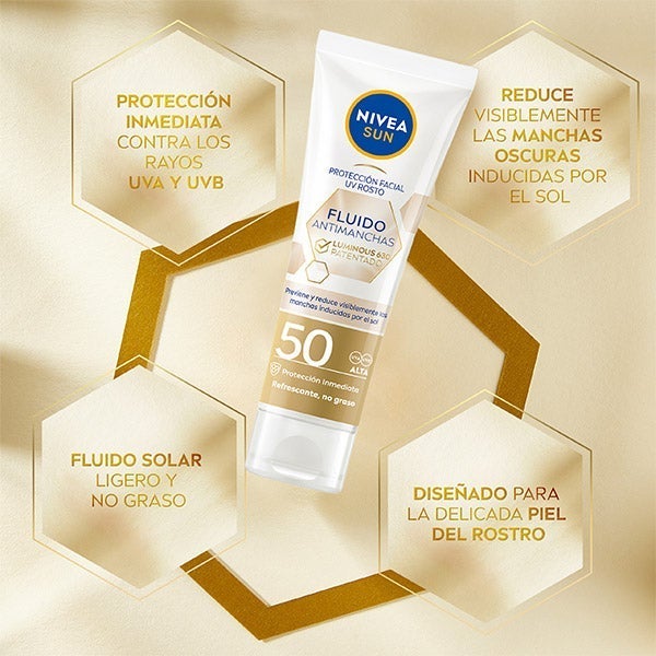 NIVEA SUN Proteção Facial UV Fluido Antimanchas Luminous630 FP50+ protege imediatamente a delicada pele do rosto contra os raios UVA/UVB. Previne e reduz visivelmente as manchas induzidas pelo sol graças ao ingrediente patenteado Luminous630 com resultados visíveis em 4 semanas. Uniformiza o tom e proporciona luminosidade à pele. Ideal para uso diário, este fluido de textura leve e não gordurosa, enriquecido com Ácido Hialurônico e Vitamina E, oferece um efeito refrescante e uma pele suave e hidratada.