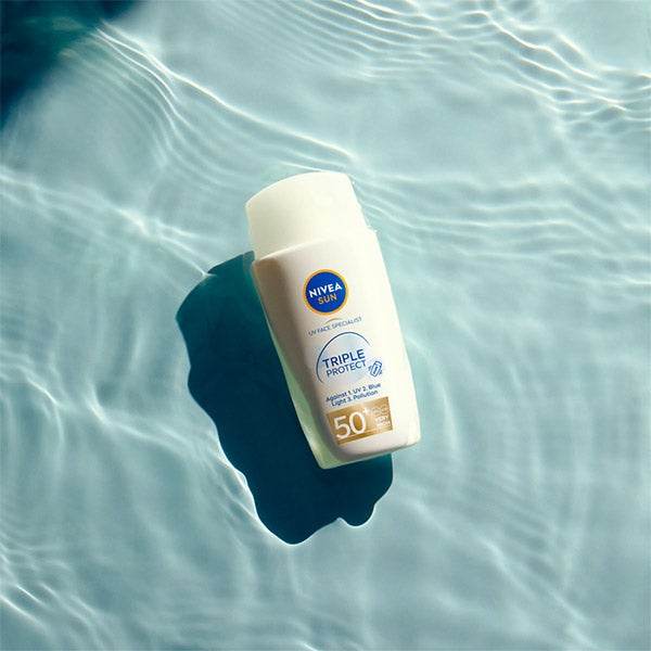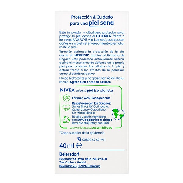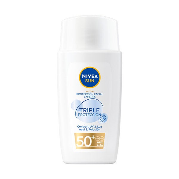 NIVEA SUN Protección Facial Experta Triple Protección Fluido Ultraligero Hidratante ofrece protección diaria contra los rayos UV, la Luz Azul y la contaminación. Este protector solar facial protege la piel sana del rostro contra la radiación ultravioleta y la luz azul, que causan daños y envejecimiento prematuro en la piel. Su fórmula contiene Extracto de Regaliz, un poderoso antioxidante natural que estimula la protección natural de la piel para proteger las células y luchar contra la contaminación y sus efectos, como el estrés oxidativo.