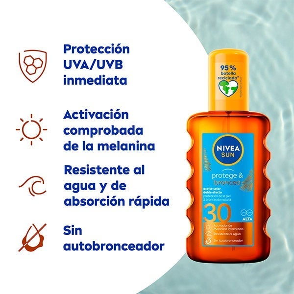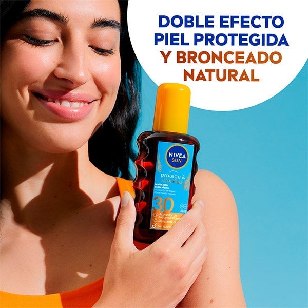 NIVEA SUN Protege & Broncea Aceite Solar FP 30 proporciona protección UV inmediata y un bronceado natural de la piel gracias al extracto pro-melanina que estimula la propia melanina de la piel. Para un bronceado bonito y saludable. Fórmula de rápida absorción, resistente al agua y sin autobronceador.