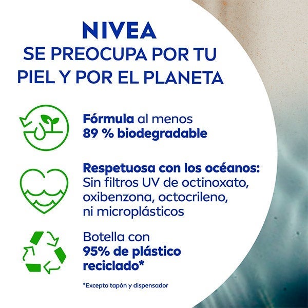 4. Sostenibilidad – Su fórmula es respetuosa con los océanos: no contiene los filtros UV Octinoxato, Oxibenzona y Octocrileno. Fórmula 89% biodegradable. Botella 95% reciclada (sin tapón ni difusor).