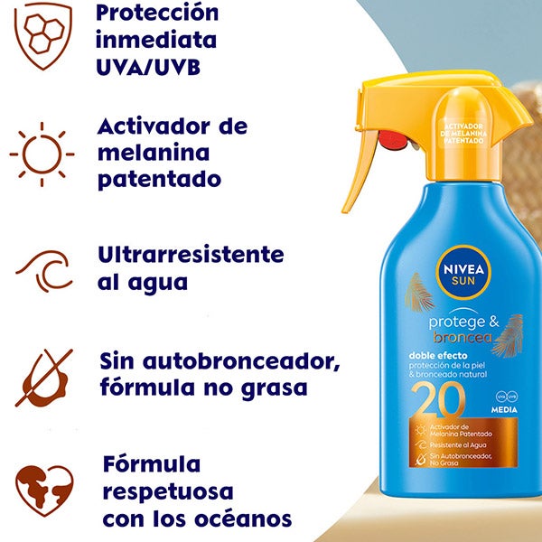NIVEA SUN Protege & Broncea Spray Solar FP 20 proporciona protección UV inmediata y un bronceado natural de la piel gracias al extracto pro-melanina que estimula la propia melanina de la piel. Para un bronceado bonito y saludable en un cómodo formato spray. Fórmula no grasa, resistente al agua y sin autobronceador.