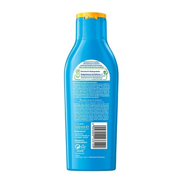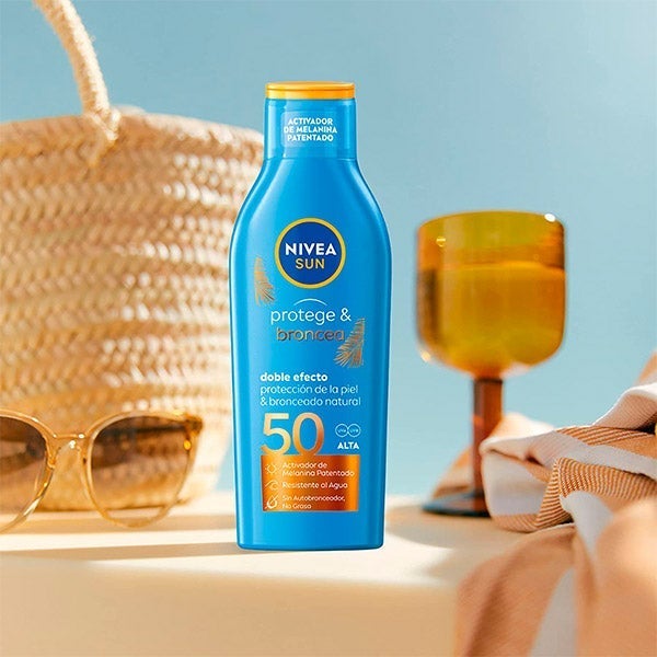 NIVEA SUN Protege & Broncea Loción Solar FP 50 proporciona protección UV inmediata y un bronceado natural de la piel gracias al extracto pro-melanina que estimula la propia melanina de la piel. Para un bronceado bonito y saludable. Su fórmula es no grasa, resistente al agua y no contiene autobronceador.
