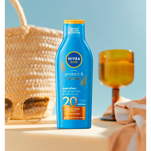 NIVEA SUN Protege & Broncea Loción Solar FP 20 proporciona protección UV inmediata y un bronceado natural de la piel gracias al extracto pro-melanina de su fórmula que estimula la propia melanina de la piel. Para conseguir un bronceado bonito y saludable. Fórmula no grasa, resistente al agua y sin autobronceador.