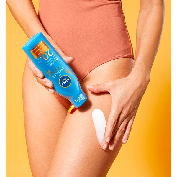 Aplica una cantidad generosa de NIVEA SUN Protege & Broncea Loción Solar FP20 antes de la exposición solar.