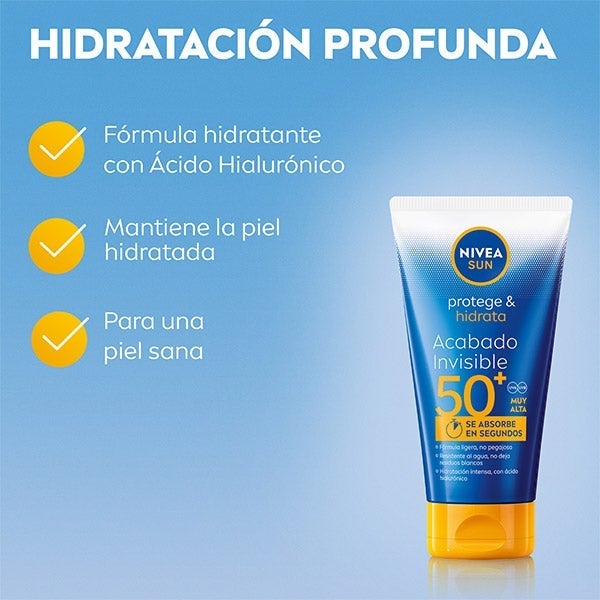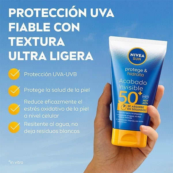 NIVEA SUN Protege & Hidrata Loção Solar Acabamento Invisível FPS 50+ oferece uma alta proteção eficaz contra os raios UVA/UVB com uma nova fórmula muito leve, não pegajosa e de acabamento invisível que é absorvida em segundos. Reduz eficazmente o estresse oxidativo da pele a nível celular. Sua fórmula é resistente à água, contém Ácido Hialurônico o que proporciona uma hidratação profunda, sem deixar resíduos brancos, para uma sensação de pele saudável e suave.