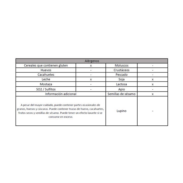A pesar del mayor cuidado, puede contener partes ocasionales de granos, huesos y cáscaras. Puede contener trazas de huevo, cacahuetes, frutos secos y semillas de sésamo.