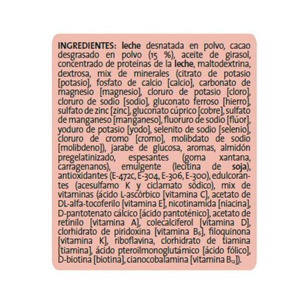 Leche desnatada en polvo, cacao desgrasado en polvo (15%), aceite de girasol, concentrado de proteínas de leche, maltodextrina, dextrosa, mix de minerales (citrato de potasio (potasio), fosfato de calcio (calcio), carbonato de magnesio (magnesio), cloruro de potasio (cloro), cloruro de sodio (sodio), gluconato ferroso (hierro), sulfato de zinc (zinc), gluconato cúprico (cobre), sulfato de manganeso (manganeso), fluoruro de sodio (flúor), yoduro de potasio (yodo), selenito de sodio (selenio), cloruro de cromo (cromo), molibdato de sodio (molibdeno)), jarabe de glucosa, aromas, almidón pregelatinizado, espesantes (goma xantana, carragenanos), emulgente (lectina de soja), antioxidantes (E-742c, E-304, E-306, E-300), edulcorantes (acesulfamo K y ciclamato sódico), mix de vitaminas (ácido L-ascórbico (vitamina C), acetato de DL-alfa-tocoferilo (vitamina E), nicotinamida (niacina), D-pantotenato cálcico (ácido pantoténico), acetato de retinilo (vitamina A), colecalciferol (vitamina D), clorhidrato de piridoxina (vitamina B6), filoquinona (vitamina K), riboflavina, clorhidrato de tiamina (tiamina), ácido pteroilmonoglutámico (ácido fólico), D-biotina (biotina), cianocobalamina (vitamina B12).