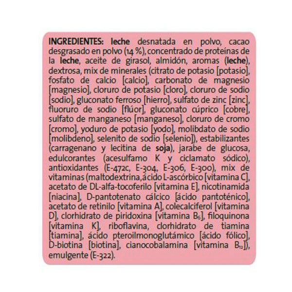 Leche desnatada en polvo, cacao desgrasado en polvo (14%), concentrado de proteínas de la leche, aceite de girasol, almidón, aromas (leche), dextrosa, mix de minerales (citrato de potasio (potasio), fosfato de calcio (calcio), carbonato de magnesio (magnesio), cloruro de potasio (cloro), cloruro de sodio (sodio), gluconato ferroso (hierro), sulfato de zinc (zinc), fluoruro de sodio (flúor), gluconato cúprico (cobre), sulfato de manganeso (manganeso), cloruro de cromo (cromo), yoduro de potasio (yodo), molibdato de sodio (molibdeno), selenito de sodio (selenio)), estabilizantes (carragenano y lecitina de soja), jarabe de glucosa, edulcorantes (acesulfamo K y ciclamato sódico), antioxidantes (E-472c, E-304, E-306, E-300), mix de vitaminas (maltodextrina, ácido L-ascórbico (vitamina C), acetato de DL-alfa-tocoferilo (vitamina E), nicotinamida (niacina), D-pantotenato cálcio (ácido pantoténico), acetato de retinilo (vitamina A), colcalciferol (vitamina D), clorhidrato de piridoxina (vitamina B6), filoquinona (vitamina K), riboflavina, clorhidrato de tiamina (tiamina), ácido pteroilmonoglutámico (ácido fólico), D-biotina (biotina), cianocobalamina (vitamina B12)), emulgente (E-322).
