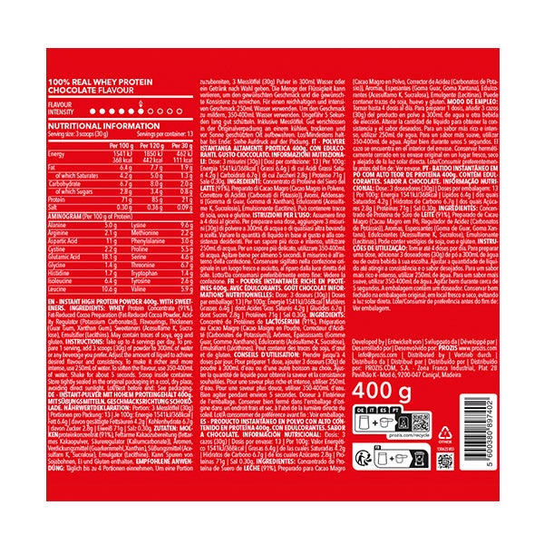 Concentrado de PROTEÍNA DE SUERO de LECHE (91%), Preparado de Cacao Magro (Cacao Magro en Polvo, Corrector de Acidez (Carbonatos de Potasio)), Aromas, Espesantes (Goma guar, Goma Xantana), Edulcorantes (Acesulfamo K, Sucralosa), Emulgente (Lecitinas). Puede contener trazas de soja, huevo y gluten.