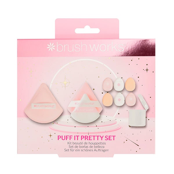 Consiga uma aplicação de maquiagem impecável sem esforço com o Brushworks Puff It Pretty Set. Distribua de maneira uniforme pós soltos e compactos com as borlas para pós, e aplique produtos líquidos e em creme com as pillow puffs.